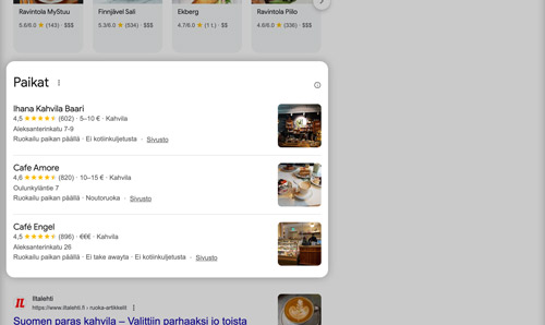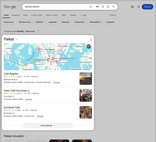 Haettaessa ”kahvila helsinki” tulossivun koko alkupuolisko on varattuna Paikat-osiolle, joka saa sisältönsä Google-yritysprofiileista. Osion täyttää karttanäkymä ja yritysesittelyt kuvineen.