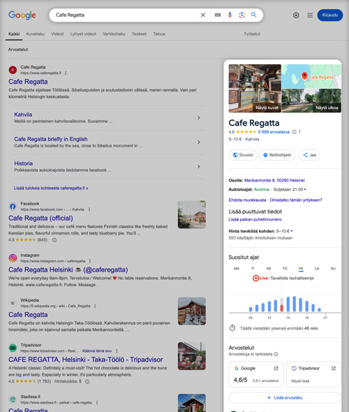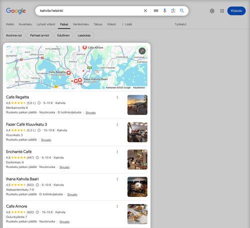 Esimerkiksi kahvila, jonka Google-yritysprofiili on optimoitu, nousee Google Mapsin ja hakutulosten kärkeen, kun käyttäjä etsii vaikkapa “kahvila lähellä”, “kahvila Helsinki” tai tapauskohtaisesti myös pelkällä haulla “kahvila”.